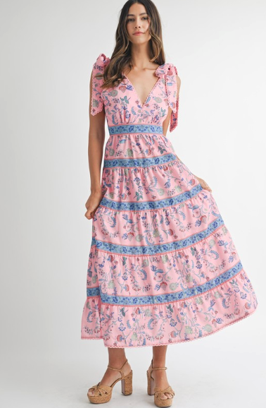 Floral Print Tiered Midi Dress With Shoulder Tie